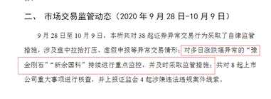 前一日(10月9日)晚間,深交所發(fā)布消息稱,9月28日至10月9日,深交所共對38起證券異常交易行為采取了自律監(jiān)管措施,涉及盤中拉抬打壓、虛假申報等異常交易情形;對多日漲跌幅異常的“豫金剛石(300064)”“新余國科”持續(xù)進(jìn)行重點監(jiān)控,并及時采取監(jiān)管措施。