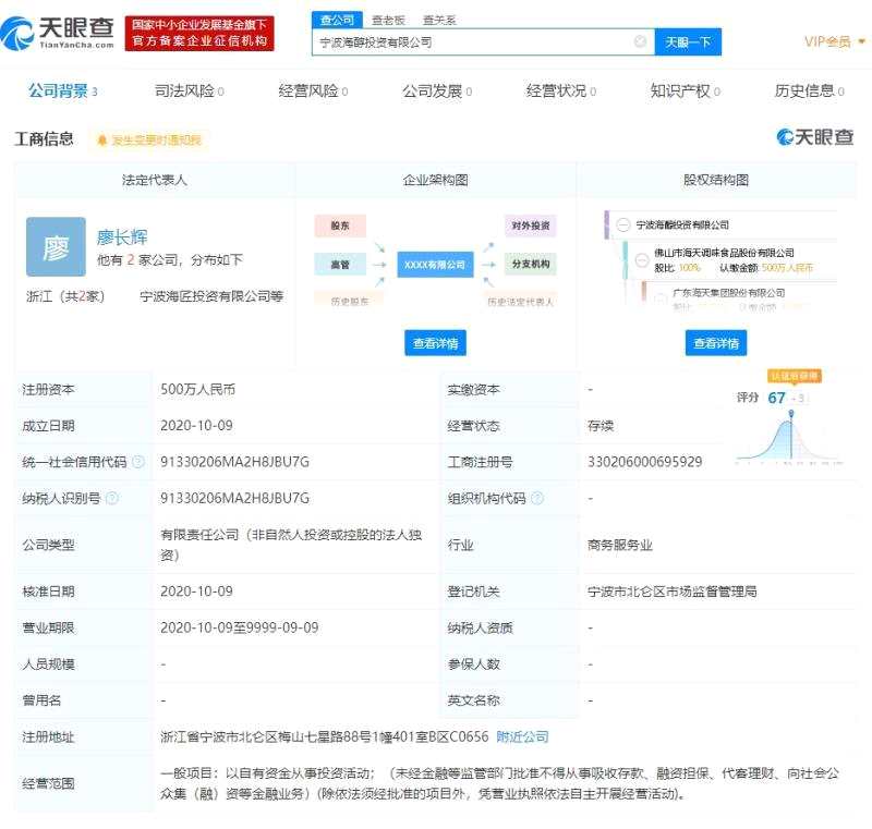 海天味業(yè)在寧波成立投資新公司 經(jīng)營(yíng)范圍含以自有資金從事投資活動(dòng)等