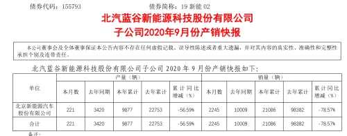10月12日,北汽藍(lán)谷(600733)發(fā)布北汽新能源9月銷量數(shù)據(jù),為2,245輛,相比去年同期的10,009輛,降幅達(dá)77.6%;1-9月累計(jì)銷量為2.1萬輛,較去年同期的9.8萬輛,下滑78.6%。