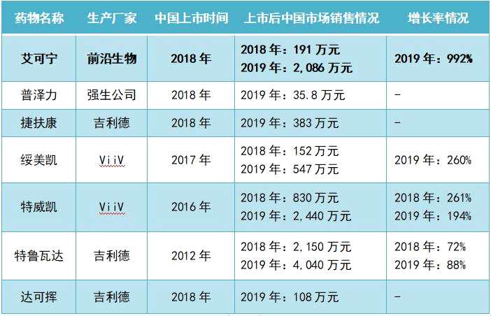 正是以上產(chǎn)品優(yōu)勢,為艾可寧快速收獲了市場認可。在其推出的第一個完整年度,也就是2019年,即實現(xiàn)了中國市場2086萬元的銷售額,同比增長992%,與強生、吉利德等行業(yè)巨頭的產(chǎn)品相比,絕對金額和相對增速都居于前列。此外,艾可寧還瞄準(zhǔn)了海外市場,已通過藥物特殊進口方式實現(xiàn)了對南非及俄羅斯的銷售。在上市時間較短的情況下,艾可寧仍需要一定時間的市場培育和推廣,其作為國家一類新藥,后續(xù)有望持續(xù)收獲醫(yī)患認可。