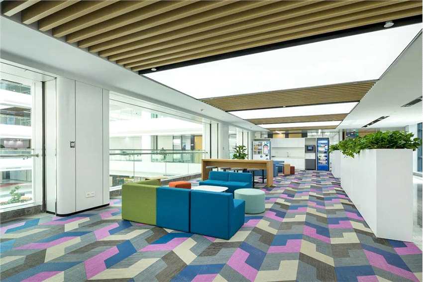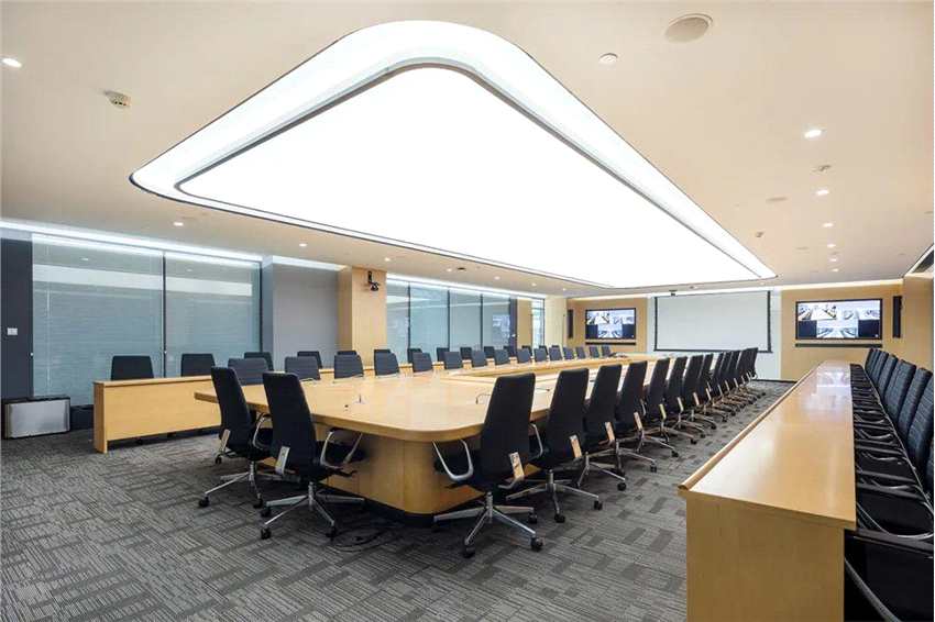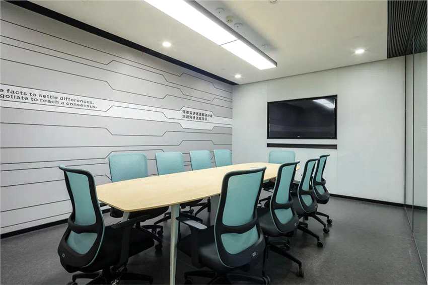 同時運用一些黑色或深色邊框的擺具用具,恰到好處的點綴其中,可以達到大面積的統(tǒng)一與小面積對比的效果,突出空間層次感,外加一些線型燈的元素,整體空間線條簡潔又明亮,讓吉利員工可以感受到自在、清靜、溫馨的氛圍。