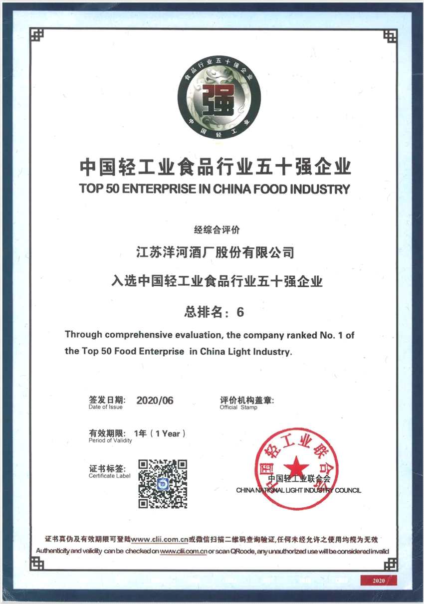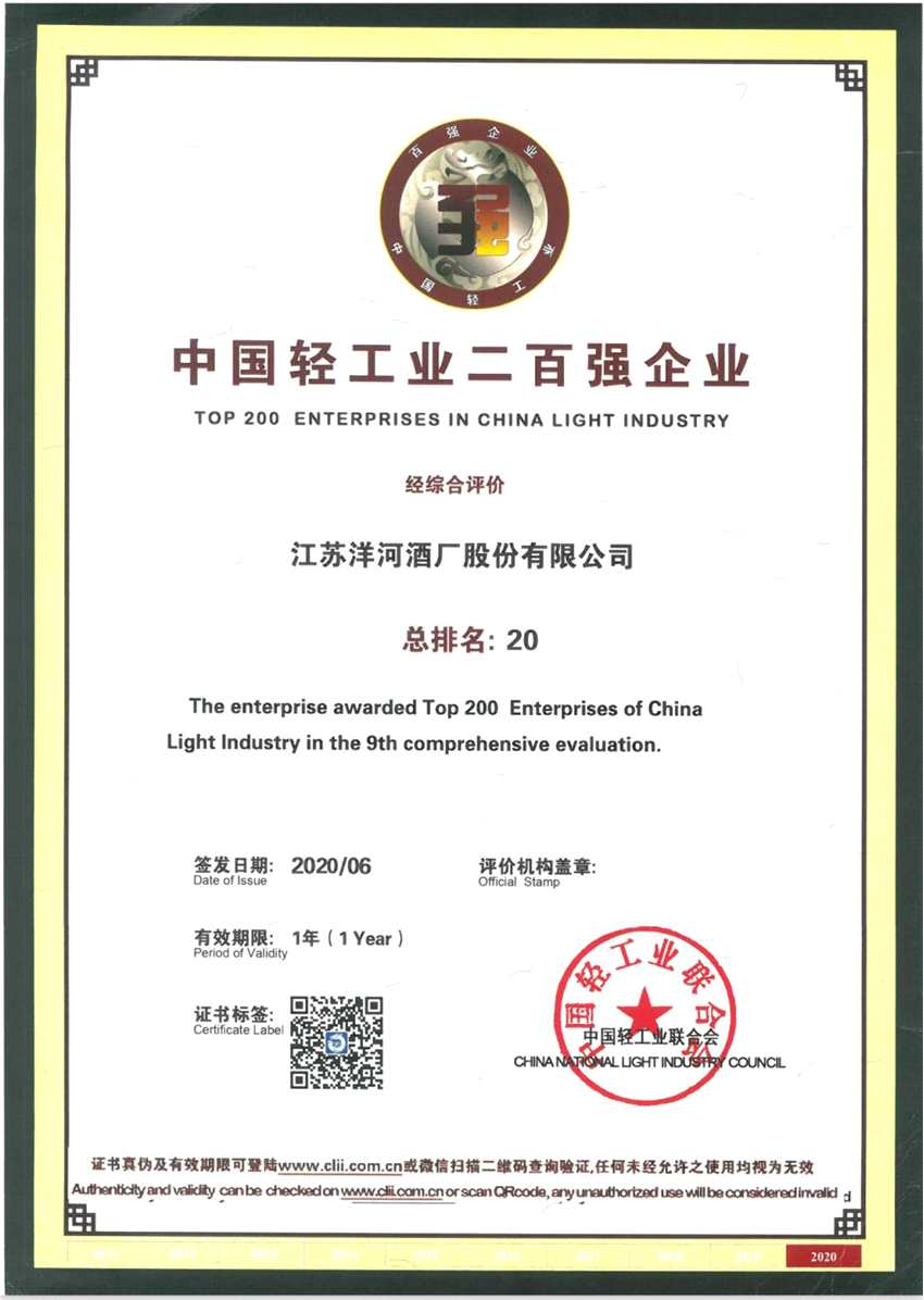 摘要: 近日,中國輕工業(yè)聯(lián)合會公布“2019年度中國輕工業(yè)二百強(qiáng)企業(yè)”名單,洋河股份(002304)通過重重篩選成功獲評,最終獲得總排名第20名的優(yōu)秀成績,表現(xiàn)出強(qiáng)大的市場競爭優(yōu)勢。