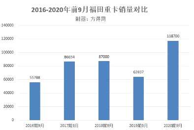 顯然,2020年前九月福田重卡的累計(jì)銷量是近五年中的最高峰。