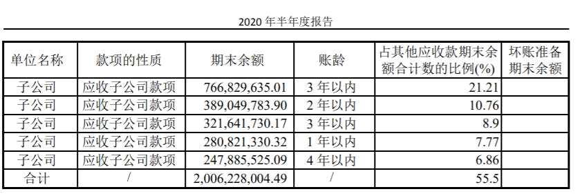 2020半年報(bào)顯示,截至2020年上半年末,人福醫(yī)藥的賬上仍然有38.31億元商譽(yù),是該公司2019年8.4億元凈利潤(rùn)的近5倍。與此同時(shí),公司來(lái)自子公司的應(yīng)收款項(xiàng)合計(jì)約20.06億元。