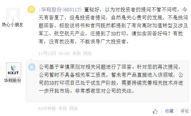 華翔股份:3D打印項目已處于試生產(chǎn)階段 公司暫時不具備相關(guān)軍工資質(zhì)