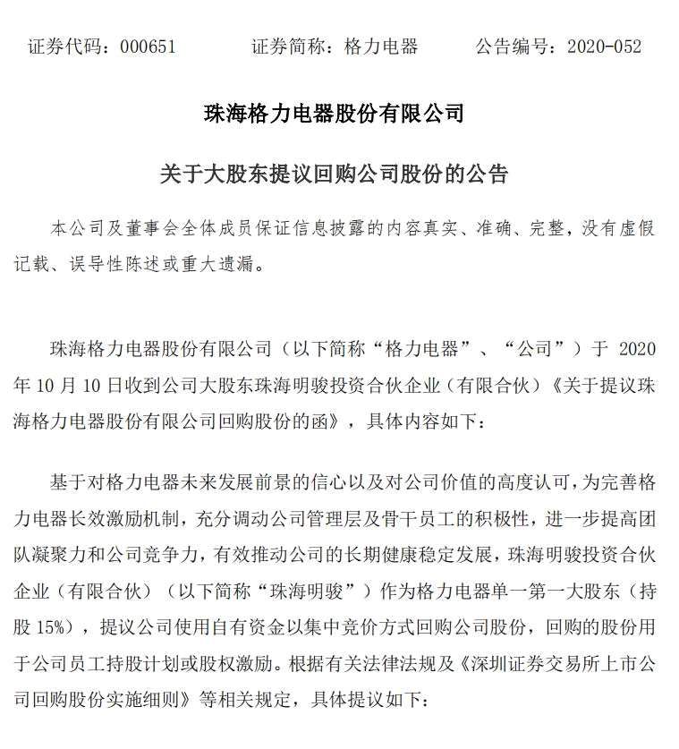 公司方面表示,回購的原因主要是基于對格力電器未來發(fā)展前景的信心和對公司價值的高度認可,建議公司回購股份用于員工持股計劃或股權激勵,充分調動公司管理層及骨干員工的積極性,進一步提升公司競爭力,促進公司長期健康穩(wěn)定發(fā)展。