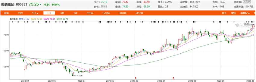 事實上,在今年7月初,大盤走出一輪牛市行情時,格力電器卻是反向節(jié)節(jié)下跌,從7月7日最高的63元,跌至9月底的53元。