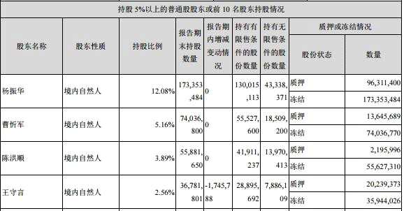 除了業(yè)績明顯下滑外,公司的控股股東及一致行動人持股還面臨著大規(guī)模遭凍結(jié)的情形。資料顯示,楊振華、曹忻軍、陳洪順、王守言是一致行動人。
