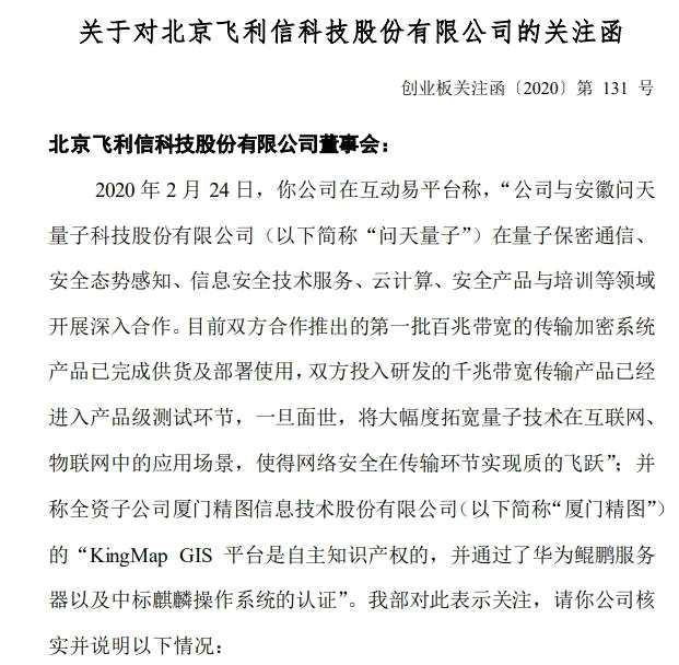 彼時(shí)華為概念受到市場追捧,2月24日,飛利信在深交所互動易上回答投資者提問時(shí)透露,與問天量子展開深入合作,“目前,雙方合作推出的第一批百兆帶寬的傳輸加密系統(tǒng)產(chǎn)品已完成供貨及部署使用……千兆帶寬傳輸產(chǎn)品已經(jīng)進(jìn)入產(chǎn)品級測試環(huán)節(jié),一旦面世,將大幅度拓寬量子技術(shù)在互聯(lián)網(wǎng)、物聯(lián)網(wǎng)中的應(yīng)用場景,使得網(wǎng)絡(luò)安全在傳輸環(huán)節(jié)實(shí)現(xiàn)質(zhì)的飛躍。”