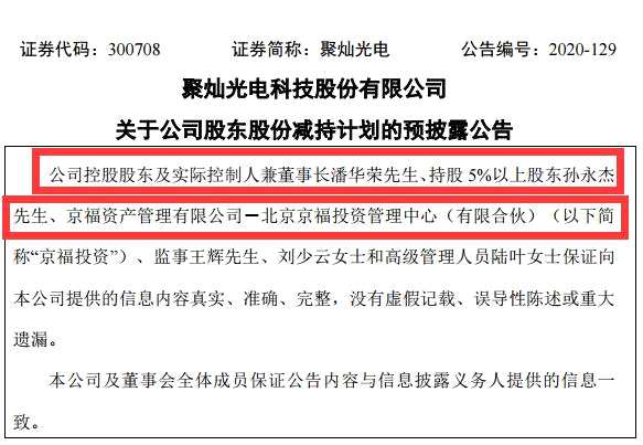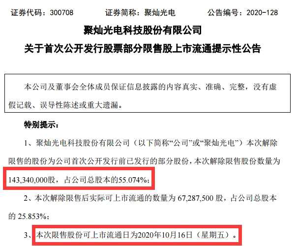 10月13日晚間,聚燦光電曾發(fā)布首次公開發(fā)行股票部分限售股上市流通提示性公告,解除限售股份數(shù)量1.43億股,占總股本55.074%。申請解除該部分股份限售的股東名單即包括:潘華榮、孫永杰、京福投資、知濤投資。