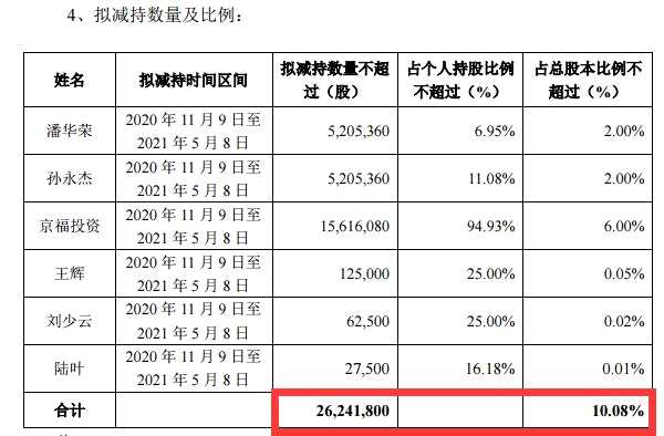根據(jù)公告顯示,控股股東及實(shí)際控制人兼董事長潘華榮、第二大股東孫永杰、第三大股東京福投資、監(jiān)事王輝、劉少云和財(cái)務(wù)總監(jiān)陸葉提交《股份減持計(jì)劃告知函》,合計(jì)擬減持?jǐn)?shù)量不超過2624.18萬股,占總股本比例不超過10.08%。
