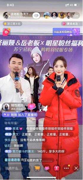 雙十一前哨打響 蘇寧攜手佟麗婭&岳老板 鴨鴨羽絨服專場直播帶貨 3619 萬元