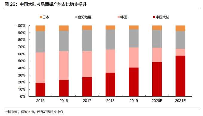 在全球競(jìng)爭(zhēng)格局中,2017年中國(guó)大陸取代韓國(guó)成為顯示面板市場(chǎng)規(guī)模第一。到2019年,中國(guó)大陸大尺寸面板市占率達(dá)到了 41.1%,對(duì)日韓臺(tái)的領(lǐng)先優(yōu)勢(shì)進(jìn)一步擴(kuò)大。 與此同時(shí),京東方和TCL華星的雙雄地位逐漸確立。隨著TCL華星完成對(duì)蘇州三星8.5代線的并購(gòu),以及京東方對(duì)中電熊貓面板線的并購(gòu),行業(yè)份額再次向這兩家頭部企業(yè)集中。