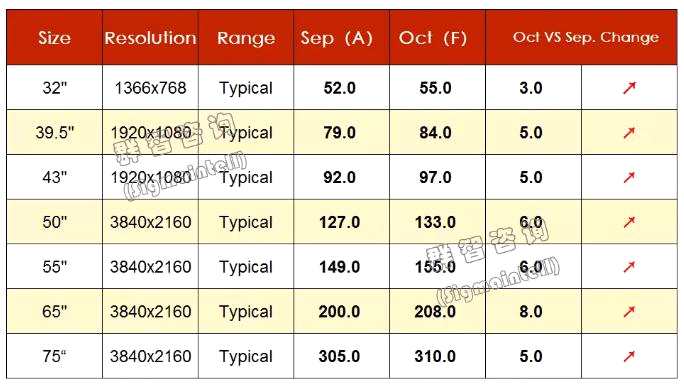 群智咨詢數(shù)據(jù)顯示,6月至9月期間,主流尺寸價(jià)格平均每月上漲了3至10美元。32寸、50寸、55寸、65寸和75寸的面板價(jià)格分別從6月份的32美金、84美金、107美金、167美金和278美金上漲到9月份的52美金、127美金、149美金、200美金和305美金,環(huán)比漲幅非常明顯。