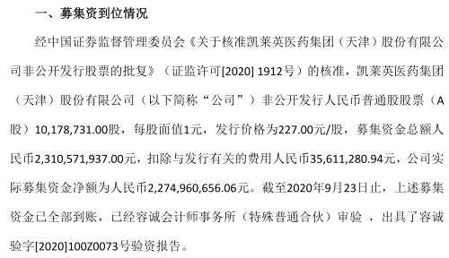 10月20日,凱萊英(002821)發(fā)布公告,經(jīng)證監(jiān)會核準,非公開發(fā)行人民幣普通股股票10,178,731.00股,發(fā)行價格為227.00元/股,募集資金總額人民幣2,310,571,937.00元,扣除與發(fā)行有關(guān)的費用人民幣35,611,280.94元,公司實際募集資金凈額為人民幣2,274,960,656.06元。截至2020年9月23日止,上述募集資金已全部到賬。