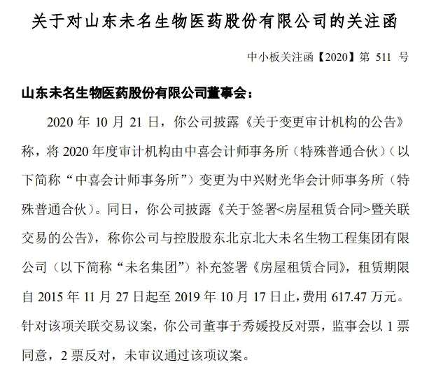 10月22日,深交所下發(fā)了關(guān)于對山東未名生物醫(yī)藥股份有限公司的關(guān)注函。對于變更審計機構(gòu),關(guān)注函指出,中喜會計師事務(wù)所連續(xù)三年對未名醫(yī)藥出具了保留意見的審計報告,要求未名醫(yī)藥說明變更 2020 年度審計機構(gòu)的具體原因和合理性,是否與中喜會計師事務(wù)所存在重大意見分歧,截止目前前述保留意見所涉事項的進展情況。