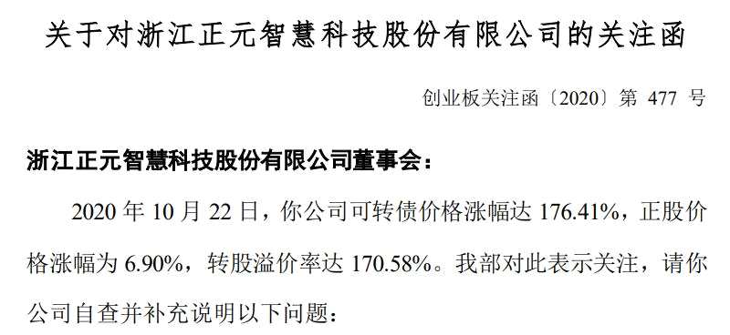 10月22日,正元轉債大漲176%,換手率6095%,正股正元智慧(300645)價格漲幅為6.90%,轉股溢價率達170.58%。晚間,正元智慧收到深交所關注函。