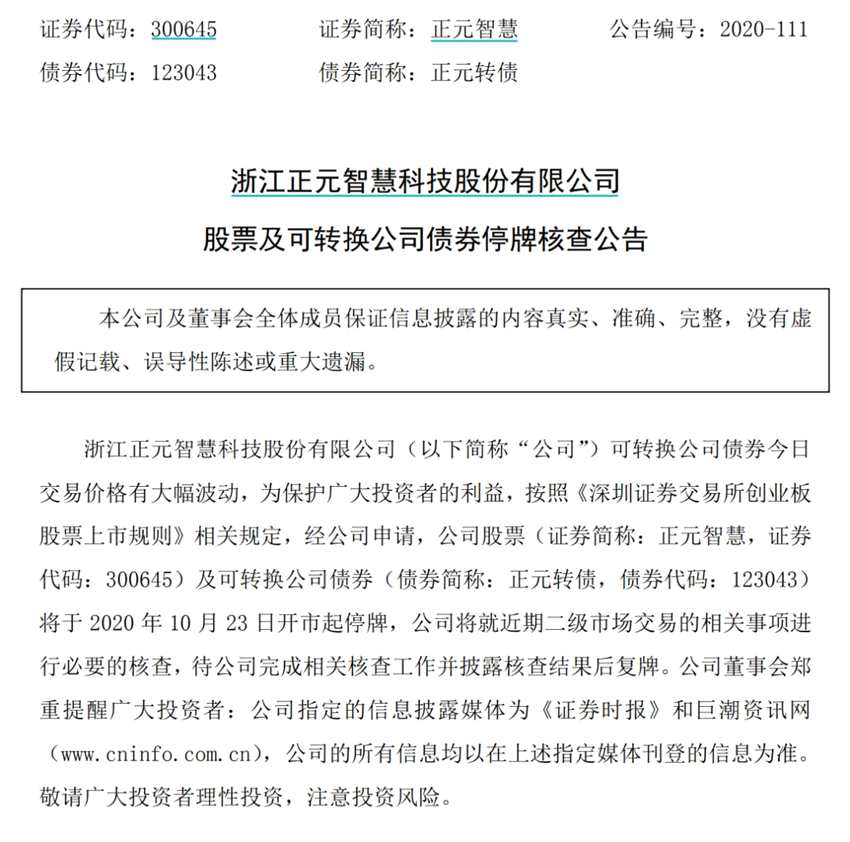 公告顯示,浙江正元智慧科技股份有限公司(以下簡稱“公司”)可轉換公司債券今日交易價格有大幅波動,為保護廣大投資者的利益,按照《深圳證券交易所創(chuàng)業(yè)板股票上市規(guī)則》相關規(guī)定,經(jīng)公司申請,公司股票(證券簡稱:正元智慧,證券代碼:300645)及可轉換公司債券(債券簡稱:正元轉債,債券代碼:123043)將于2020年10月23日開市起停牌,公司將就近期二級市場交易的相關事項進行必要的核查,待公司完成相關核查工作并披露核查結果后復牌。