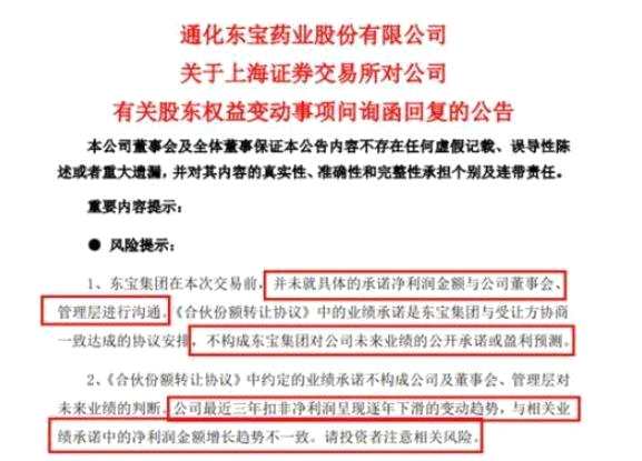 對于深交所火速下發(fā)的關(guān)注函,通化東寶連夜緊急公告對于大股東的業(yè)績承諾并不知情,撇清了關(guān)系。