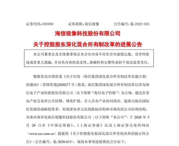 為支持海信集團(tuán)進(jìn)一步深化混改,建設(shè)世界一流企業(yè),青島市國(guó)資委牽頭研究制定了《海信集團(tuán)深化混合所有制改革實(shí)施方案》,以集團(tuán)下屬核心企業(yè)海信電子為主體,通過引進(jìn)戰(zhàn)略投資者注入社會(huì)資本,激發(fā)企業(yè)發(fā)展活力?!秾?shí)施方案》于2020年5月13日經(jīng)市政府第94次常務(wù)會(huì)議審議通過,海信集團(tuán)劃入華通集團(tuán),成為青島市繼雙星后的第二家實(shí)施集團(tuán)層面混改的市屬國(guó)企。