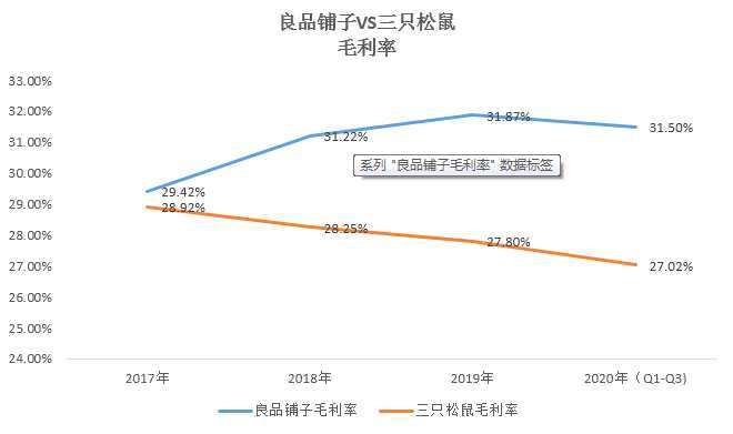 在“高端化”戰(zhàn)略的加持下,良品鋪子的毛利率也領(lǐng)先行業(yè),這一特征可從與其體量相當(dāng)、同是主營堅果類零食的三只松鼠的比較中得出。過去三年多的數(shù)據(jù)顯示,良品鋪子的毛利率均高出三只松鼠,目前良品鋪子毛利率仍然領(lǐng)先三只松鼠4.5個百分點。