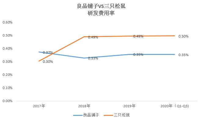 財報顯示,從2018年開始至2020年三季度,三只松鼠的研發(fā)費用率均高出良品鋪子,且這一特征還有擴(kuò)大的趨勢。