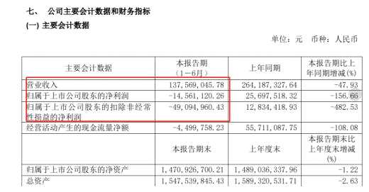 根據(jù)莎普愛思半年報,1-6月營業(yè)收入137569045.78元,歸屬于上市公司股東的凈利潤為-14561120.26元,歸屬于上市公司股東的扣除非經(jīng)常性損益的凈利潤為-49094960.43元。