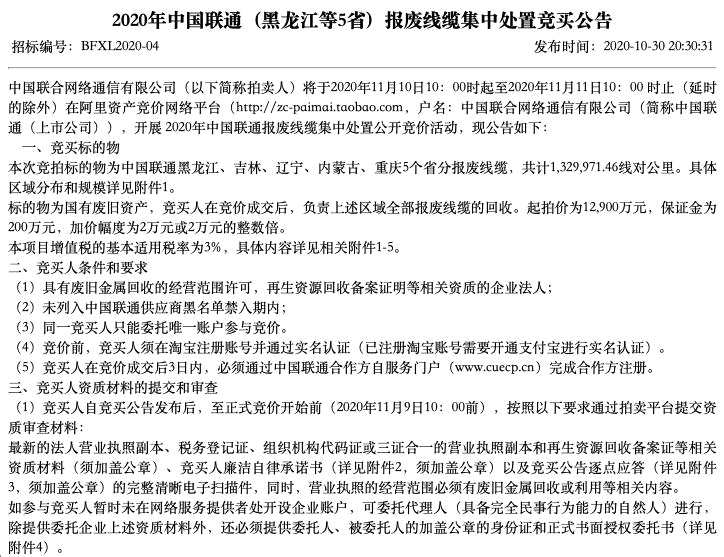 聯(lián)通表示,標的物為國有廢舊資產(chǎn),競買人在競價成交后,負責上述區(qū)域全部報廢線纜的回收。