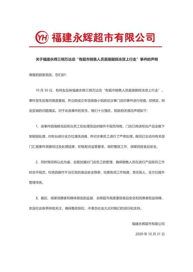 11月1日消息,針對近日網(wǎng)友反映福建永輝三明萬達(dá)店“有超市銷售人員直接腳踩凍貨上行走”事件,永輝超市(601933)官方回應(yīng)稱,已將產(chǎn)品全數(shù)下架銷毀,并對涉事員工進(jìn)行嚴(yán)肅處理。