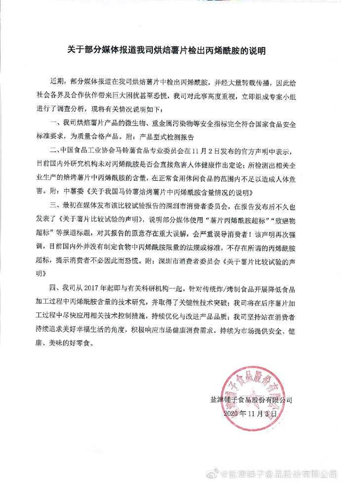 鹽津鋪子(002847)11月3日在官網(wǎng)發(fā)布說明稱,公司生產(chǎn)的烘焙薯片產(chǎn)品的微生物、重金屬污染物等安全指標(biāo)完全符合國家食品安全標(biāo)準(zhǔn)要求,為質(zhì)量合格產(chǎn)品。