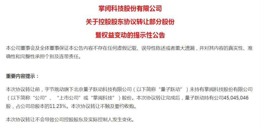 11月4日晚間,【掌閱科技(603533)、股吧】(603533)公告,公司控股股東、實際控制人成湘均、張凌云與量子躍動簽訂了《北京量子躍動科技有限公司與張凌云、成湘均關(guān)于掌閱科技股份有限公司之股份購買協(xié)議》及補充協(xié)議,成湘均和張凌云擬將其分別持有的2252.25萬股、2252.25萬股無限售流通股份協(xié)議轉(zhuǎn)讓給量子躍動。量子躍動持有公司4504.50萬股,占公司總股本的11.23%。量子躍動是字節(jié)跳動的子公司,字節(jié)跳動持有其100%的股權(quán)。