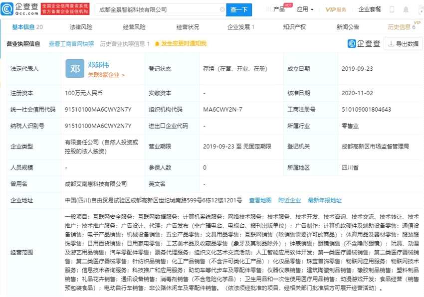 企查查APP顯示,11月2日,成都艾南惠科技有限公司發(fā)生工商變更,原股東魏家耀退出,新增股東三六零(601360)科技集團(tuán)有限公司,持股100%。同時(shí),公司更名為成都全景智能科技有限公司,經(jīng)營范圍變更為:互聯(lián)網(wǎng)安全服務(wù);互聯(lián)網(wǎng)數(shù)據(jù)服務(wù);計(jì)算機(jī)系統(tǒng)服務(wù)等。企查查工商信息顯示,該公司成立于2019年,法定代表人為鄧邱偉,注冊資本100萬元人民幣。