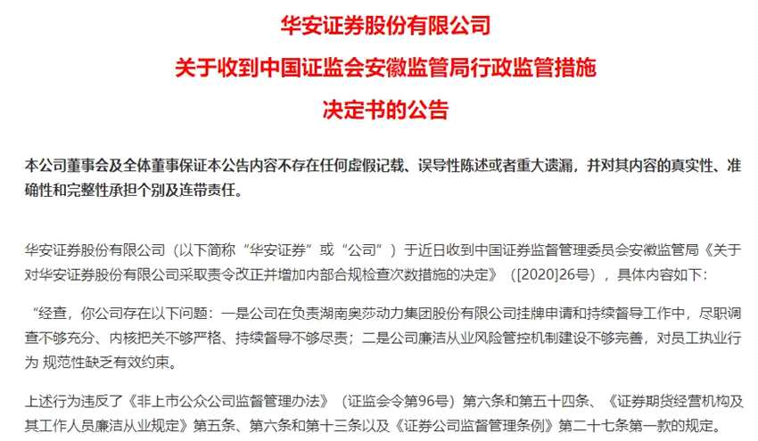 11月9日,華安證券發(fā)布公告稱,公司近日收到安徽證監(jiān)局《關(guān)于對(duì)華安證券股份有限公司采取責(zé)令改正并增加內(nèi)部合規(guī)檢查次數(shù)措施的決定》。經(jīng)查,華安證券主要存在兩大問題: