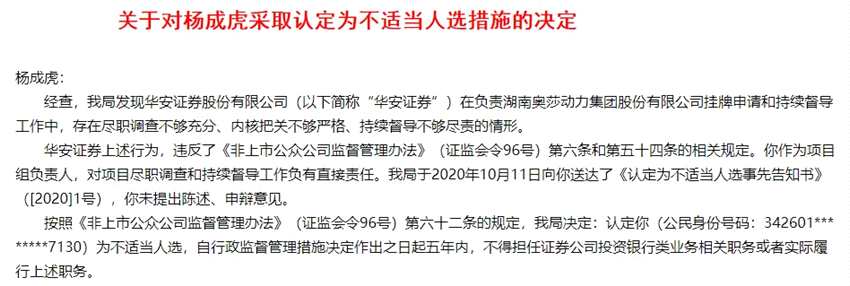 領(lǐng)下罰單的不止是華安證券。奧莎動(dòng)力項(xiàng)目的負(fù)責(zé)人,時(shí)任華安證券時(shí)任投行部業(yè)務(wù)總監(jiān)楊成虎也被問責(zé)。