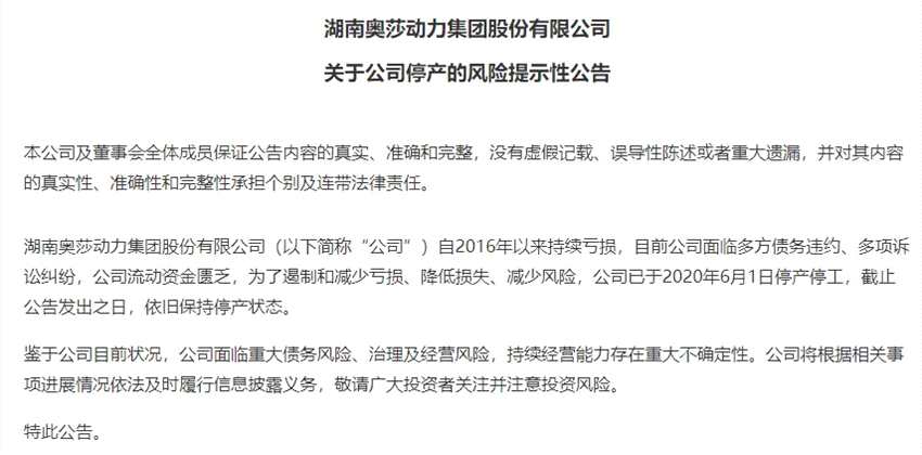 更糟的還在后頭。2020年11月3日,奧莎動(dòng)力發(fā)布公告稱,公司已于2020年6月1日停產(chǎn)停工,目前依舊保持停產(chǎn)狀態(tài)。