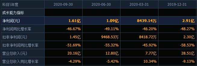 今年10月27日晚間,公司發(fā)布三季度業(yè)績公告稱,2020年前三季度營收約20.16億元,同比下降4.29%;凈利潤約1.61億元,同比下降46.67%;基本每股收益0.12元,同比下降42.86%。