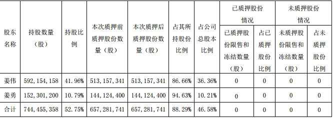 根據(jù)11月10日公司發(fā)布的關(guān)于控股股東部分股份質(zhì)押延期購回的公告顯示,公司控股股東姜偉先生及其一致行動人質(zhì)押股份數(shù)量為657,281,741 股,累計占其所持公司股份數(shù)量比例 88.29%。