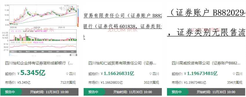 四川省成都市中級人民法院將于11月30日公開拍賣成都銀行(601838)7210.48萬股股份(約占成都銀行股權(quán)的2%),每股定價為2020年10月20日的收盤價10.69元/股,起拍價約為7.71億元。