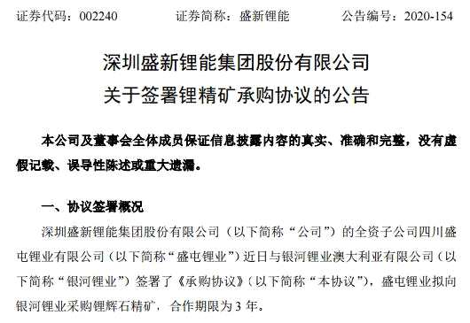 盛新鋰能向銀河鋰業(yè)采購(gòu)鋰礦 每年不低于6萬(wàn)噸
