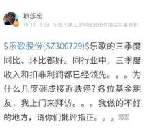 不過(guò)到了10月30日,樂(lè)歌股份發(fā)布了三季報(bào)的次日,該股股價(jià)出現(xiàn)大跌,項(xiàng)樂(lè)宏又坐不住了,他發(fā)文稱稱“樂(lè)歌的三季度同比、環(huán)比都好,同行業(yè)中,三季度收入和扣非利潤(rùn)都已經(jīng)領(lǐng)先,為什么幾度砸成跌停?各位基金朋友,我上門來(lái)拜訪,我做的不好的地方,請(qǐng)你們批評(píng)指正。”