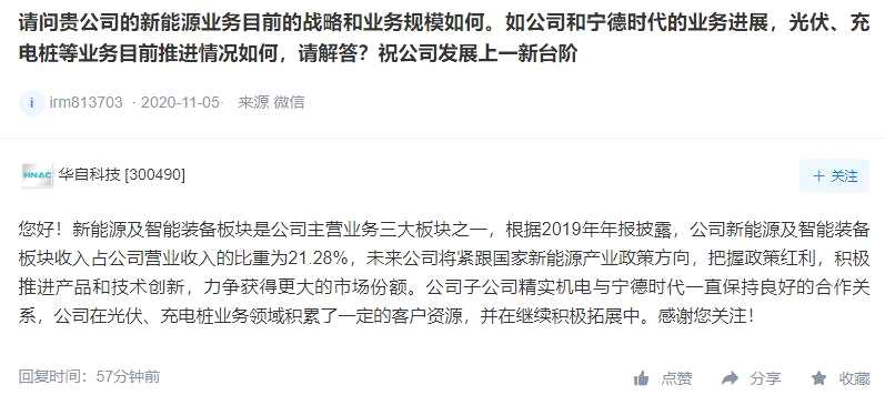 華自科技(300490)在互動(dòng)平臺(tái)上表示,新能源及智能裝備板塊是公司主營(yíng)業(yè)務(wù)三大板塊之一,未來(lái)公司將緊跟國(guó)家新能源產(chǎn)業(yè)政策方向,把握政策紅利,積極推進(jìn)產(chǎn)品和技術(shù)創(chuàng)新,力爭(zhēng)獲得更大的市場(chǎng)份額。子公司精實(shí)機(jī)電與寧德時(shí)代(300750)一直保持良好的合作關(guān)系,公司在光伏、充電樁業(yè)務(wù)領(lǐng)域積累了一定的客戶資源,并在繼續(xù)積極拓展中。