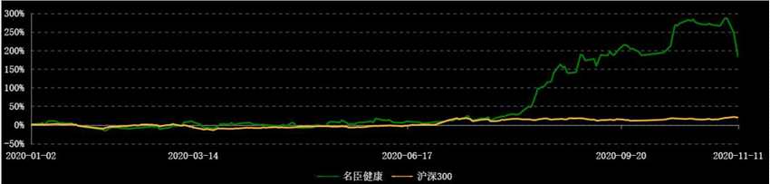 數(shù)據(jù)顯示,名臣健康股價自11月8日創(chuàng)出歷史新高后,便一連走出3個跌停,累計跌幅已超過20%?;仡櫰涔蓛r走勢,1個月累計跌幅僅為4.25%,近3個月來漲幅達90.39%,近半年漲幅則超191%,遠遠超過同期滬深300指數(shù)漲幅。