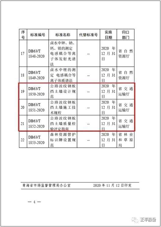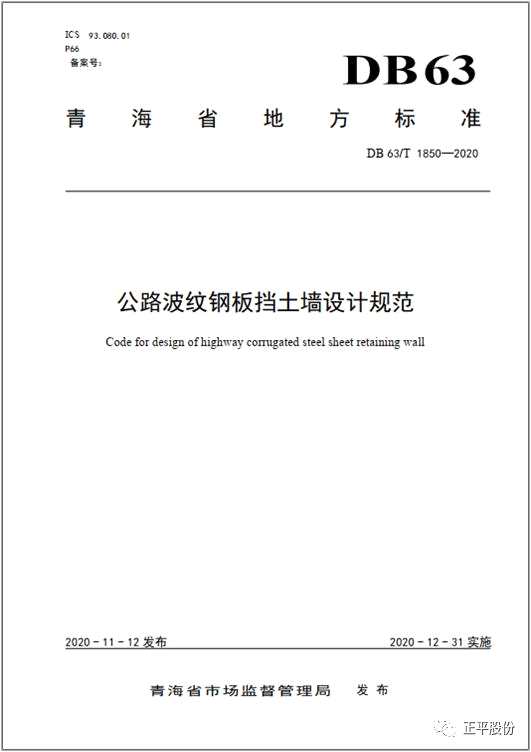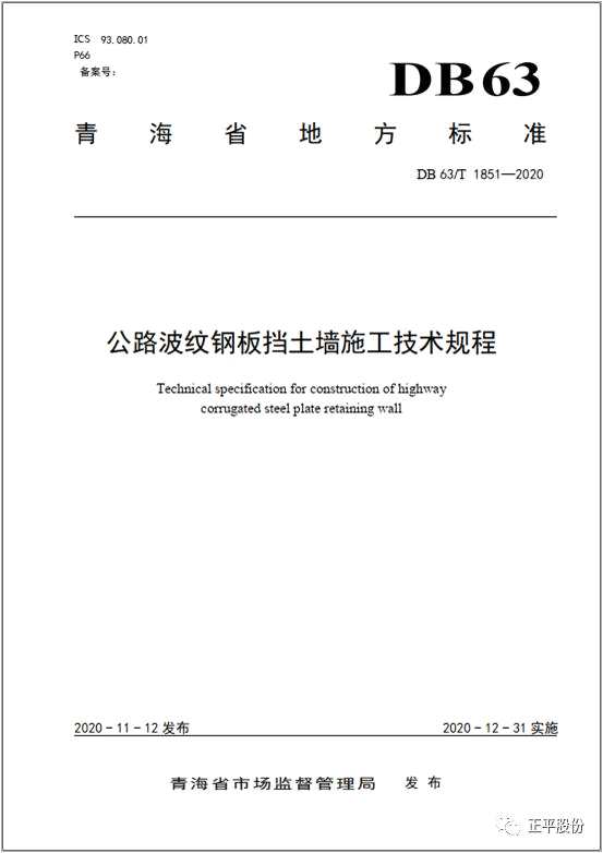 【正平股份(603843)、股吧】(603843)標(biāo)準(zhǔn)研編工作近日再傳佳績(jī),主研主編且國(guó)內(nèi)首創(chuàng)的《公路波紋鋼板擋土墻設(shè)計(jì)規(guī)范》(DB63/T 1850-2020)、《公路波紋鋼板擋土墻施工技術(shù)規(guī)程》(DB63/T 1851-2020)和《公路波紋鋼板擋土墻質(zhì)量檢驗(yàn)評(píng)定指南》(DB63/T 1852-2020)三項(xiàng)地方標(biāo)準(zhǔn)獲青海省市場(chǎng)監(jiān)督管理局批準(zhǔn)發(fā)布,并將于2020年12月31日起正式實(shí)施。