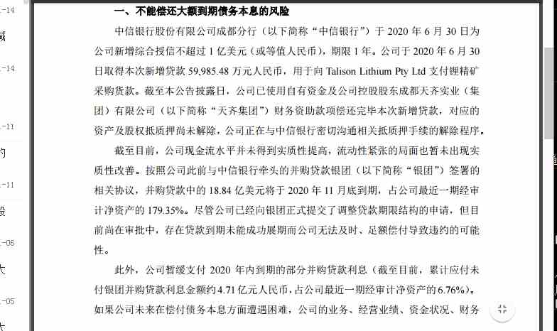11月13日晚間,天齊鋰業(yè)發(fā)布公告自曝稱,公司與中信銀行牽頭的并購(gòu)貸款銀團(tuán)(下稱“銀團(tuán)”)籌借的并購(gòu)貸款中的18.84億美元(約合人民幣125.93億元)將于今年11月底到期。盡管天齊鋰業(yè)已經(jīng)向銀團(tuán)提交了調(diào)整貸款期限的申請(qǐng),但目前尚在審批中,存在貸款到期未能成功展期而公司無(wú)法及時(shí)、足額償付導(dǎo)致違約的可能性。