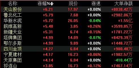 板塊內(nèi),天山股份(000877)領漲,漲至6.21%;魯北化工(600727)、華新水泥(600801)、皖維高新(600063)和新疆天業(yè)(600075)跟漲,漲超5%。