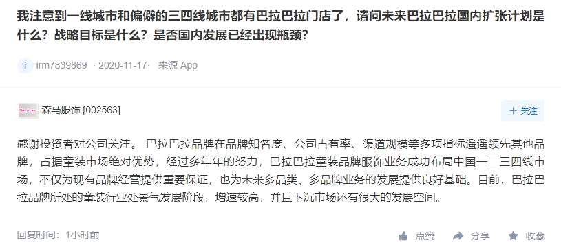 森馬服飾:巴拉巴拉所處童裝行業(yè)正值景氣發(fā)展階段 下沉市場還有很大發(fā)展空間