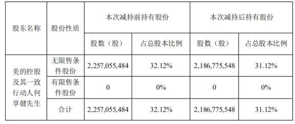 本次減持前,美的控股及其一致行動(dòng)人何享健持有股份為22.57億股,占公司總股本32.12%;本次減持后,美的控股及其一致行動(dòng)人何享健持有股份為21.87億股,占公司總股本31.12%。