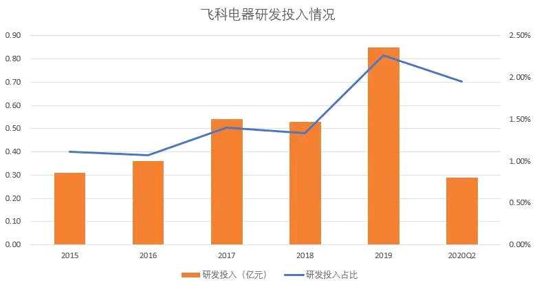 飛科上市之前每年的研發(fā)投入占比都在1%,2012年-2014年的研發(fā)投入占比分別為0.75%、0.76%、0.79%,遠低于【蘇泊爾(002032)、股吧】(002032)、九陽、老板等小家電同行。直到上市前夕才將研發(fā)投入占比提升到1%以上,2019年是上市之后研發(fā)投入最高的年,占比達到2.26%。