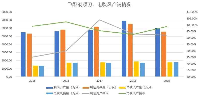 從飛科兩款主打產(chǎn)品的產(chǎn)銷量變化來看,自2016年之后產(chǎn)銷率就持續(xù)下滑,說明市場需求逐漸減弱。雖然近三年的產(chǎn)銷率一直保持在90%以上的高位,但同時也要注意到兩款產(chǎn)品的產(chǎn)量連續(xù)數(shù)年滯漲的瓶頸。