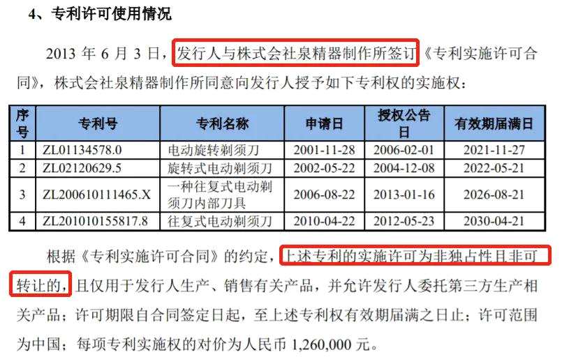 根據(jù)公司招股書顯示,2013年6月3日,公司與日本株式會社泉精器制作簽署《專利實施許可合同》,專利實施的許可為非獨占性且非可轉(zhuǎn)讓的,僅限于公司生產(chǎn)銷售有關(guān)產(chǎn)品,許可范圍為中國,且每項專利將支付126萬的對價。